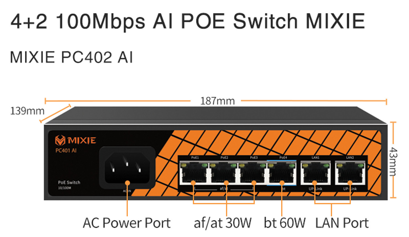 SWITCH POE MIXIE PC402(4+2)100MBS TỐI ĐA 250M CHỐNG SÉT
